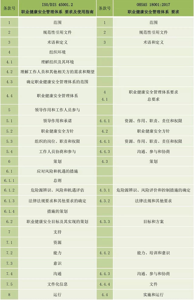 ISO 45001的構(gòu)建是在OHSAS 18001已有的規(guī)范上,其主要目標(biāo)是相同的,都是為提高組織的職業(yè)健康安全績效。同時(shí),通過以下表1框架的對(duì)比,也存如下不同之處: