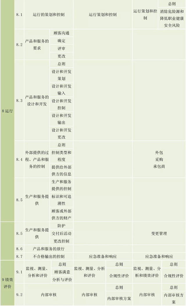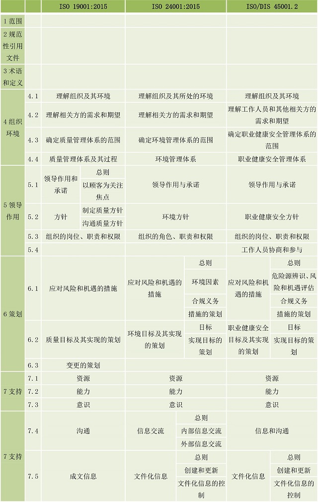 在國內(nèi),組織都是將各個(gè)管理體系進(jìn)行整合,質(zhì)量、環(huán)境、職業(yè)健康安全管理體系作為ISO標(biāo)準(zhǔn),均使用了高階結(jié)構(gòu),為體系的整合提供了便利。表2將三個(gè)體系的框架進(jìn)行了對(duì)應(yīng)于合并,可供讀者參考。